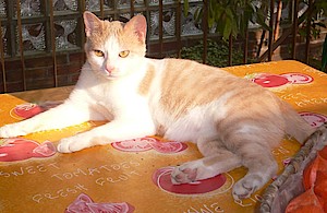 Im Juli 2001 wurde in Langenfeld ein großer, kastrierter, ca. 4 Jahre alter Kater gefunden, wir nannten ihn Fernando; die Suche nach seinen Besitzern blieb erfolglos. Zunächst kam er nach Haan in eine Pflegestelle mit vielen anderen Katzen. Eines Tages spazierte er ungesehen durch die Haustür und blieb einige Tage auf der Rolle. Als er davon genug hatte, kam er ganz lässig zurück. Um die Vorzüge dieses Traumkaters einem vielköpfigem Publikum vorzustellen, wurde er mit nach Köln geschleppt zur Aufnahme der Sendung "Tiere suchen ein Zuhause". Anschließend sollte er bis zur Abholung nach Haan ein paar Stunden in Langenfeld verbringen. Was tat Fernando? Er machte sich wieder auf den Weg, diesmal erkundete er die Geschäftsstraße in Langenfeld. Die Pflegemutter kam zufällig mit dem Auto daher, wo Fernando seelenruhig den Bürgersteig entlang marschierte. Daraufhin erklärte sich eine ältere Dame mit Etagenwohnung und Balkon bereit, ihn in Pflege zu nehmen und sich 24 Std. um diesen Burschen zu kümmern. Und das funktionierte: Fernando war ausgeglichen.