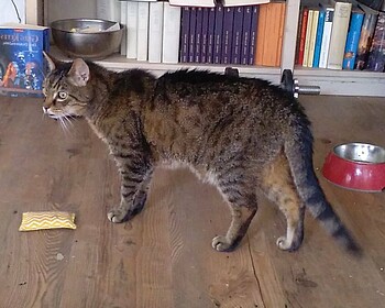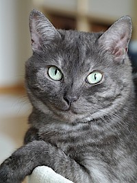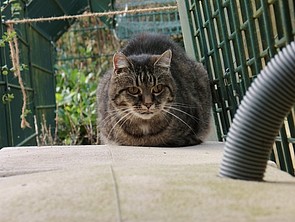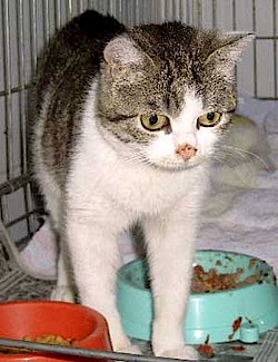 Karli kam mit ca. einem Jahr zur AGT; ein Kater mit British-Kurzhaar-Gesicht. Er hatte eine irreparable Missbildung im Hals, die ihm außer leichten Atembeschwerden überhaupt keine Probleme machte. Wir fanden, dass das auf keinen Fall ein Einschläfern rechtfertigte, da Karli nämlich ein putzmunteres Kerlchen war, das sich auch mit anderen Katzen ausgezeichnet verstand.