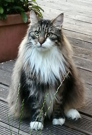 Whisky hatte schon ein bewegtes Leben hinter sich: Er wurde von einer Frau aus Kroatien mitgebracht. Sie wollte ihn als Zweitkatze zu ihrem vorhandenen Kater. Aber der wollte keine fremden Götter neben sich haben. So kam er als Alleinkatze zu einem jungen Mann, der leider kurze Zeit später an Krebs verstarb. Da war Whisky schon 13 Jahre alt und sollte ins Tierheim. Als sein jetziges Frauchen davon erfuhr, ließ sie das nicht zu und nahm Whisky auf.