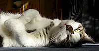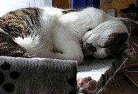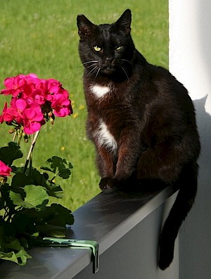 Am 17.05.2005 brachte die AGT uns beide Burschen ins Haus, allerdings brachte sich jeder der Beiden erstmal in Sicherheit, denn welche Katze mag schon Umzüge? In der Nacht wurden wir allerdings dann von Charly lautstark darauf aufmerksam gemacht, daß ein Katzenmagen nicht bis zum nächsten Morgen warten kann! Wir sind gehorsame Dosenöffner, daher sind wir diesem Wunsch natürlich sehr gerne nachgekommen. Sein Kumpel Debbie brauchte allerdings einen Tag länger, um sich bei uns bemerkbar zu machen. Charly war im ganzen Haus und im Garten unterwegs und hat alles ganz genau erkundet. Besonders gerne mochte er sonnige Plätze. Auf dem Kratzbaum vor dem Fenster, auf dem Gartenstuhl (natürlich gepolstert) oder einfach nur platt auf dem Boden in der strahlenden Sonne!