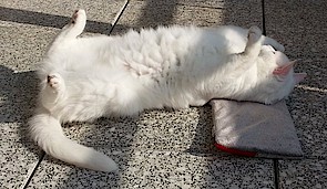 Franco war ein ganz besonderer Kater, nach ca. 6 Monaten war der Bann gebrochen und ich konnte alles mit ihm machen , er vertraute mir blind . Er lief mir hinterher wie ein Hund, auf Kommando legte er sich hin und ich gab ihm einen Schubs und er rutschte im Liegen übers Laminat und stand erst auf, nach dem die Rutscherei stoppte .