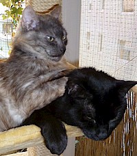 So kam Johannes 10 Tage später wieder zurück nach Haan - und blieb. Er verstand sich mit meinen anderen Katzen, aber vor allem mit Josha, die Beiden waren wie eineiige Zwillingen, ihm und mir galt seine große Liebe. Inzwischen schlief er auch mit im Bett. Aber es entwickelte sich eine böse chronische Zahnfleischentzündung, die nur mit Kortison behandelt werden konnte, homöopatische Mittel schlugen nicht an. So fuhr Johannes ca. alle 4 Wochen zur TA-Praxis Hartmann, in den letzten Jahren mit Heidi Temme, weil sie ja oftmals einen Weg zu ihrer Lieblingspraxis fahren mußte. Nach der Behandlung ging es ihm jedesmal richtig gut: Er aß gut und bekam richtige Spielattacken. Aber die Zeituhr lief und es ging ihm immer ein wenig schlechter. Zum Schluß hatte sich in seiner Mundhöhle ein Tumor gebildet, so dass Heidi und Gisela ihn erlösten.