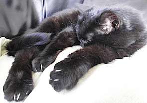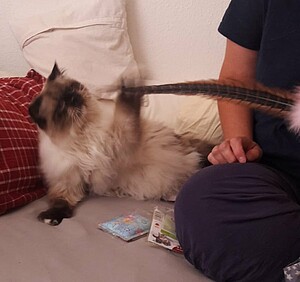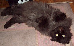 Peppina war die schüchterne, die erst einmal eilig hinter dem Sofa verschwand. Nach einigen Stunden war die Neugier aber größer als das Entsetzen und sie sah sich ganz vorsichtig um. Mein Freund, bis dahin Katzen gegenüber eher reserviert, wurde im Sturm erobert, indem sie ihn einfach als Teil des Sofas betrachtete und es sich auf seinem Bauch gemütlich machte. Ein Anblick, der immer wieder erfreute: Peppina bequem auf Tom’s Bauch ausgestreckt, seinen Atembewegungen entsprechend sanft auf und ab schaukelnd und ihm dabei tief und zufrieden in die Augen sehend.... Wegen ihrer langen dichten Haare musste sie natürlich häufig gekämmt werden, ein Akt, den sie zunächst entschieden ablehnte und den sie mit der Zeit dann aber liebte.